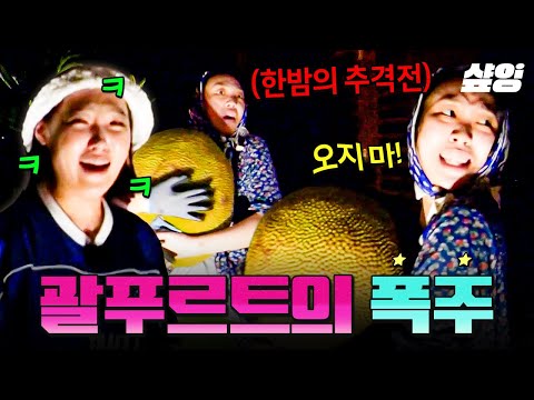 #뿅뿅지구오락실 세계에서 가장 큰 과일의 위엄🌟 23kg 잭프루트 안고 한밤의 추격전 벌이는 영지 っ(;・o・)っ
